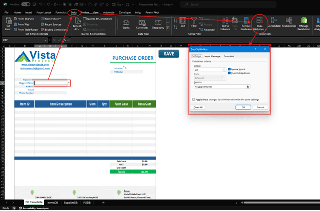 Data validation is a feature that allows you to control what type of data can be entered into a particular cell. It allows you to ensure that users input only valid data. In our PO form, we want to ensure the user inputs only registered items and suppliers. This helps in maintaining data integrity and accuracy in your spreadsheet. It also acts as an easier way of entering data in a form since it allows you to select values from a dropdown list.