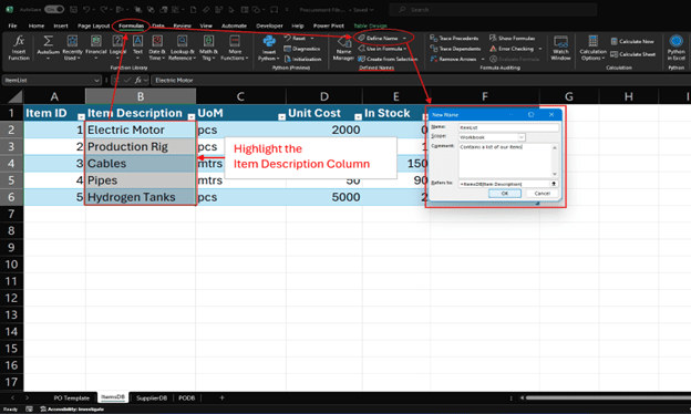 - Navigate to the Formulas Tab and in the Defined Names group, click on the “Define Name” button. A pop-up will appear that lets you change the name and add some comments. In the name field, change the name to ItemList and a comment(optional) and click OK.