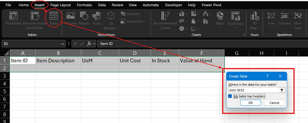 - Highlight all your column headers and one row below it [A1:F2]. Click the Insert tab and on the Tables group, click ‘Table’. A pop-up will appear on the screen that asks you if your table has headers. If it is not already checked, check it and click okay.