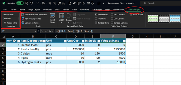 - After inserting the table, Excel automatically opens the ‘Table Design’ tab where you can customize the table. On the left of the Table Design tab, in the Properties Group, change the table name from “Table1” to “ItemsDB”. It is important to give your tables a memorable name so that it becomes easy to reference their columns when using functions.