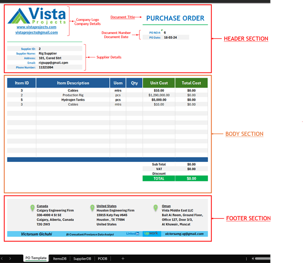 In this section, you will learn how to design a form that is printable and exportable to PDF for filing or e-mailing. There are plenty of PO templates online which you can draw inspiration from. You can copy and paste a design you like onto your worksheet and do some editing to fit your style. As standard, the template you choose should have these sections:
