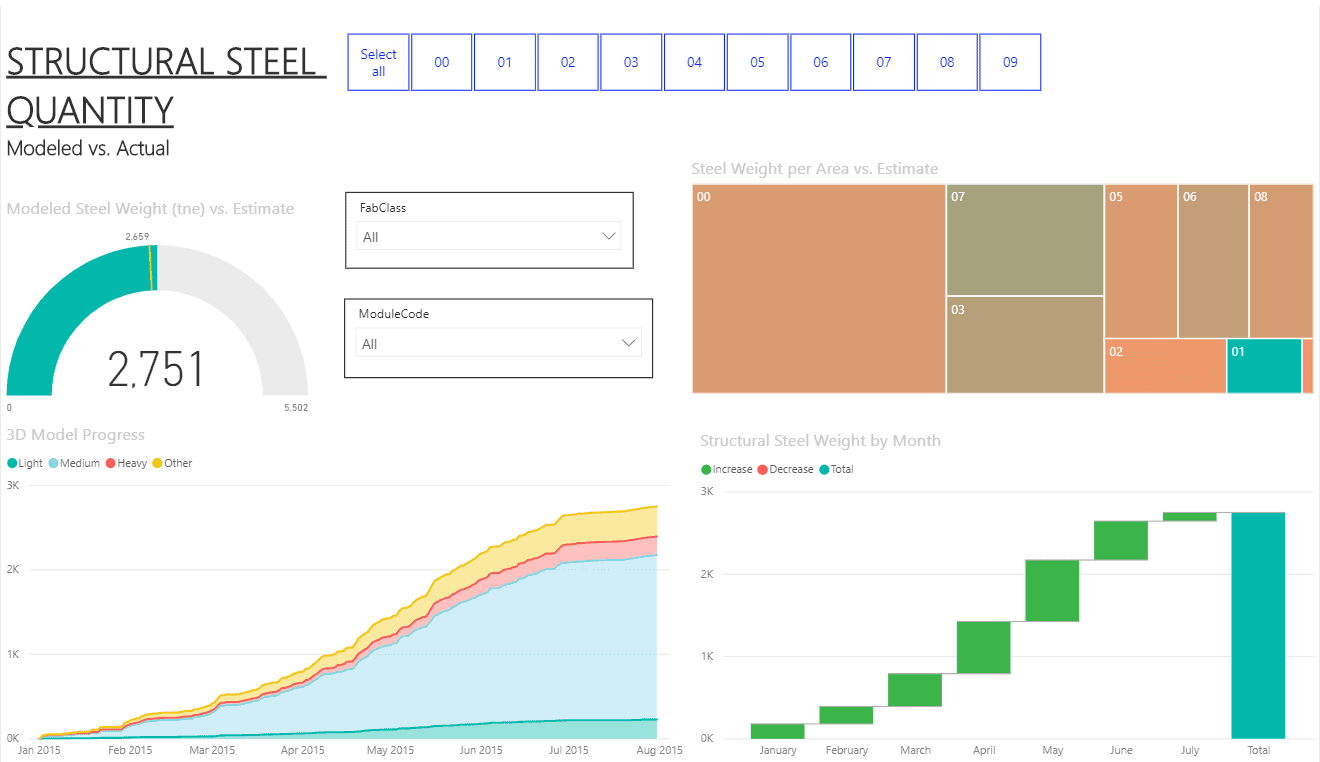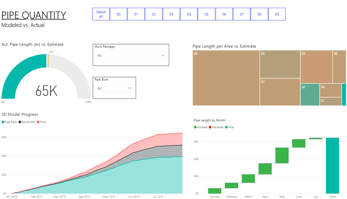 Figures 2 and 3 represent data visualizations that have helped our clients keep their fingers on the pulse of the key project indicators without allocating costly engineering hours for reporting. Tracking the total pipe quantities and steel weights against previous estimates provides a high degree of certainty that the project will avoid unwanted surprises.